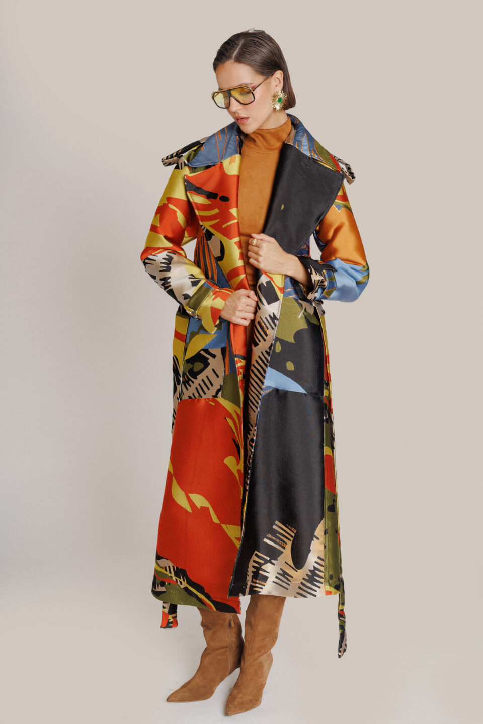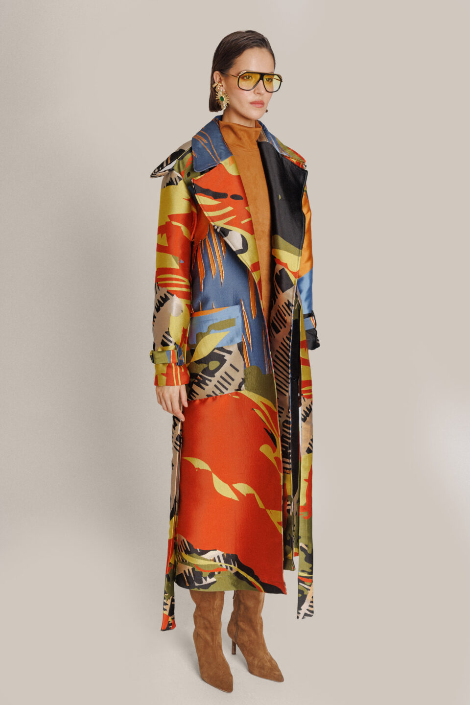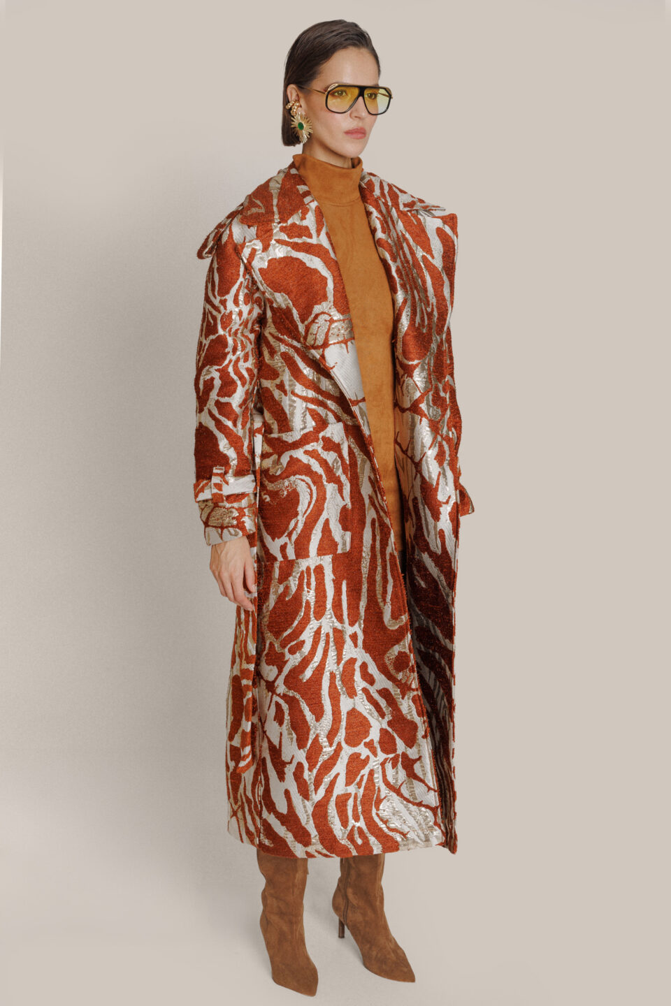 Özel tasarım jakar dokuma kumaştan, Eclectic atölyesinde üretilmiştir.