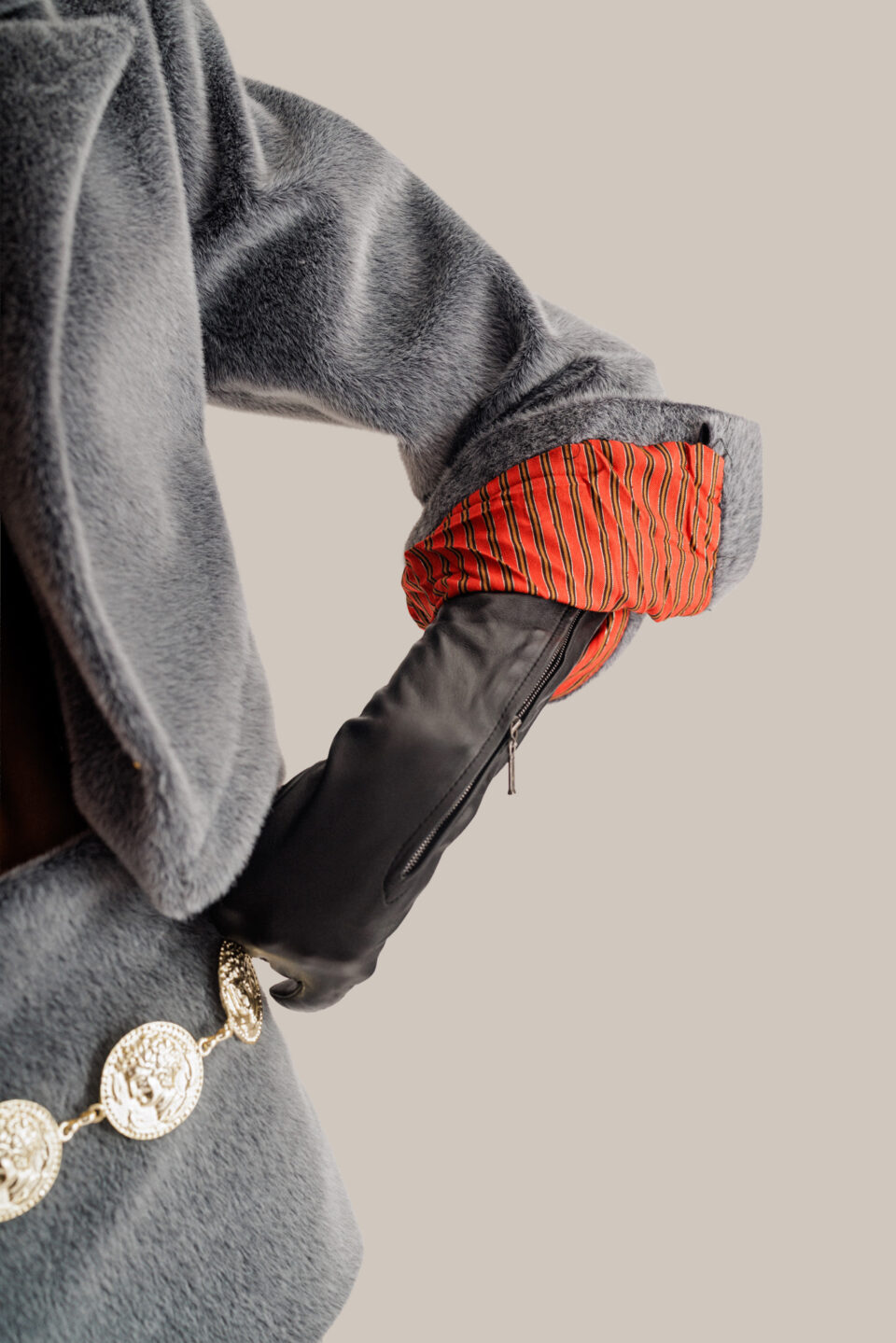Parlak çizgi dokulu kumaştan özel olarak Eclectic atölyesinde üretilmiştir.