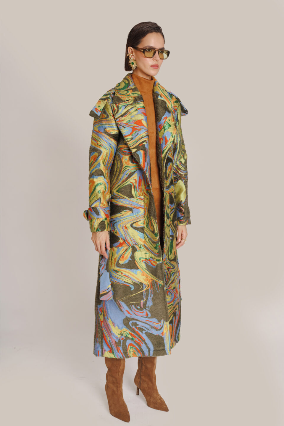 Özel tasarım dokulu swirl desenli kumaştan, Eclectic atölyesinde üretilmiştir.