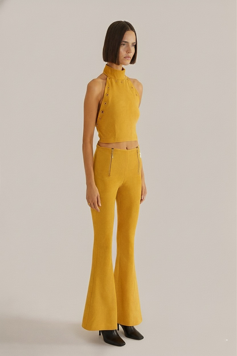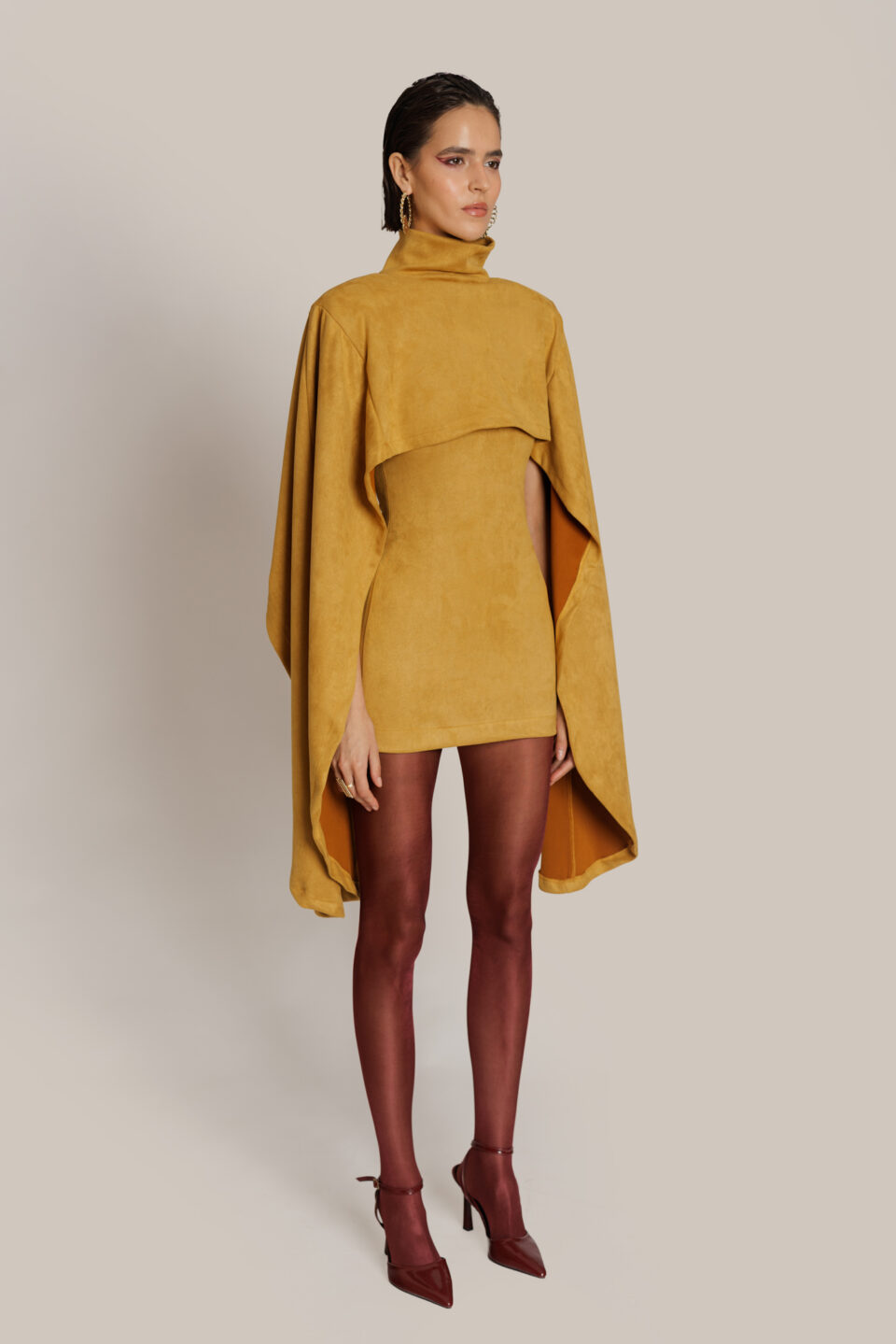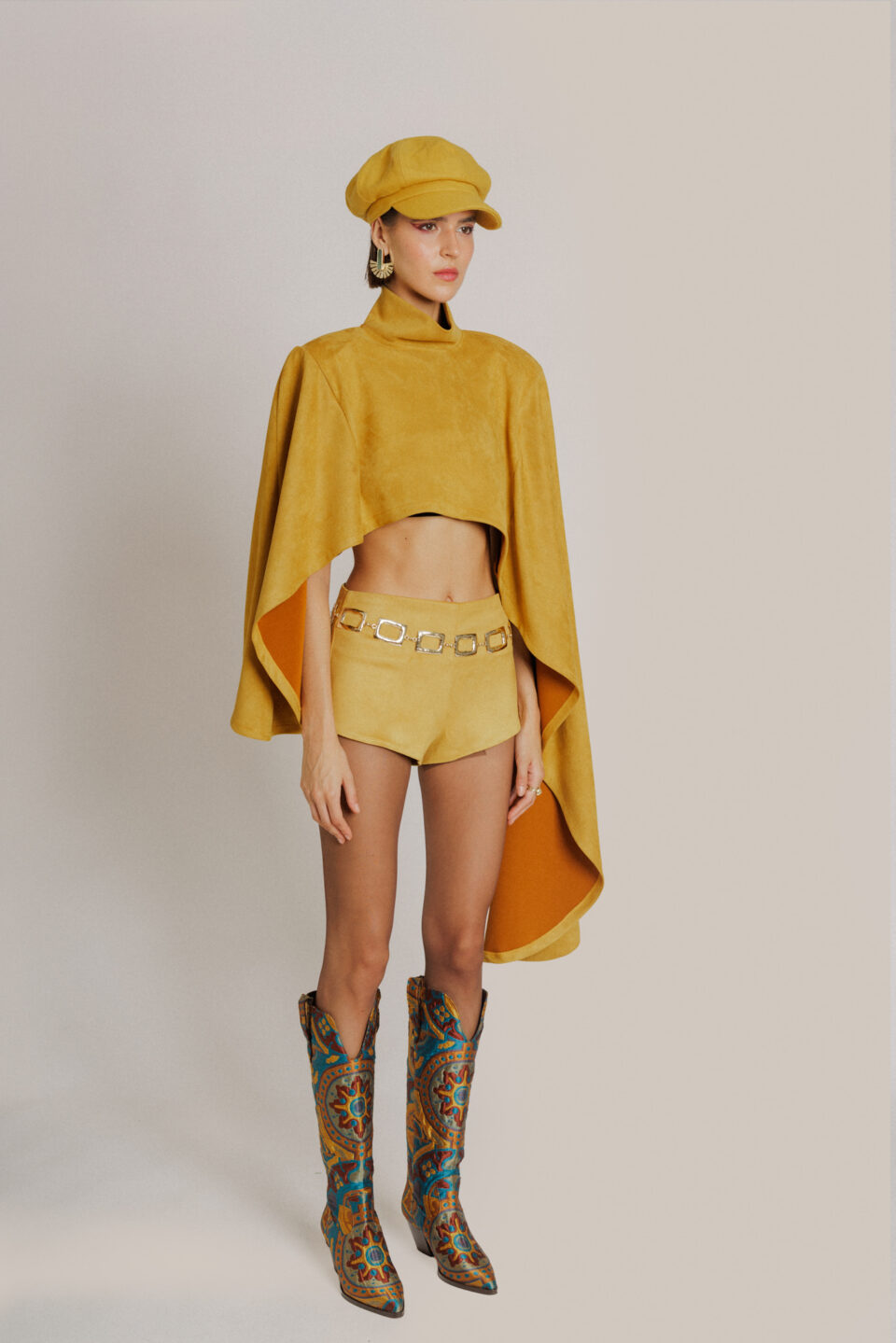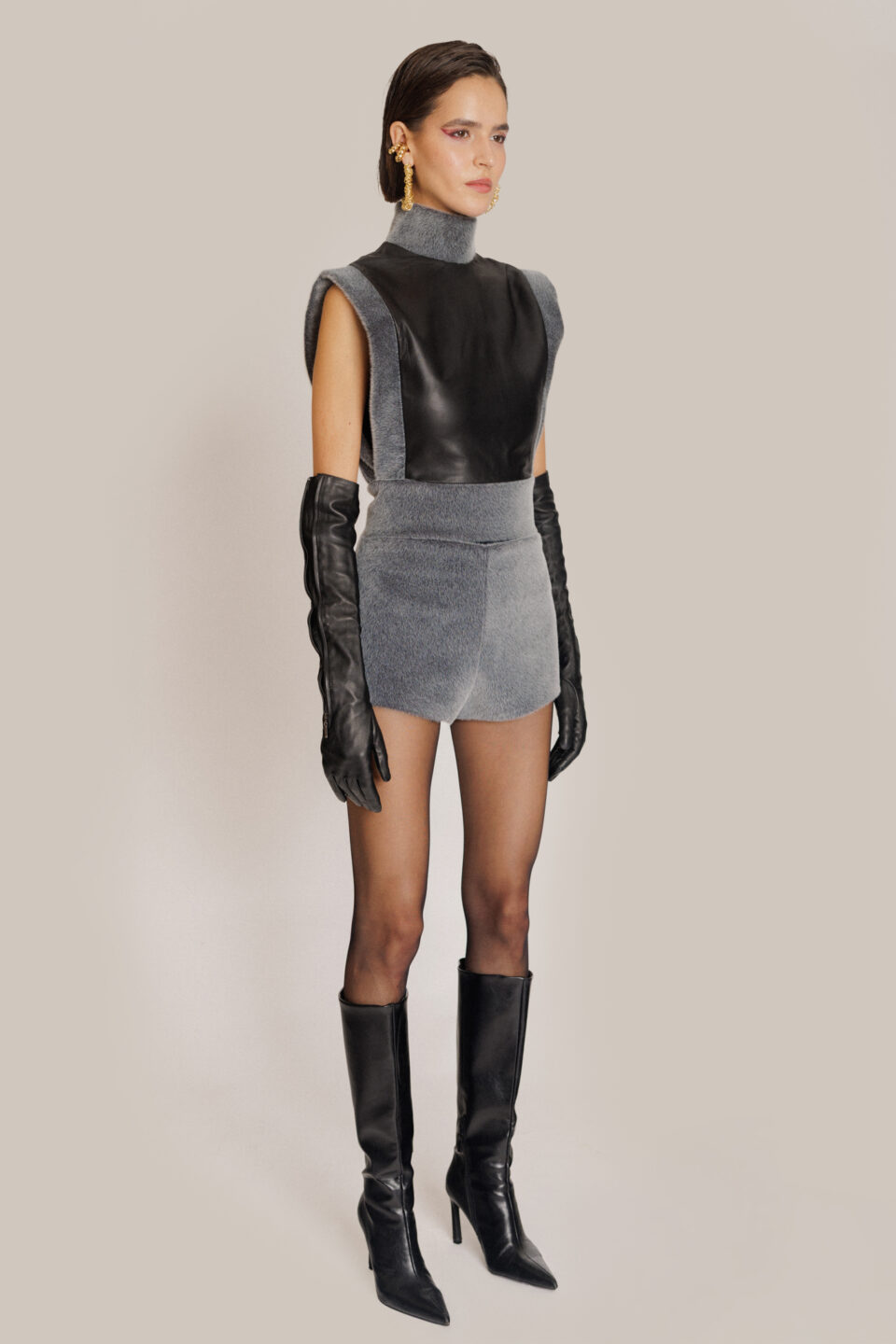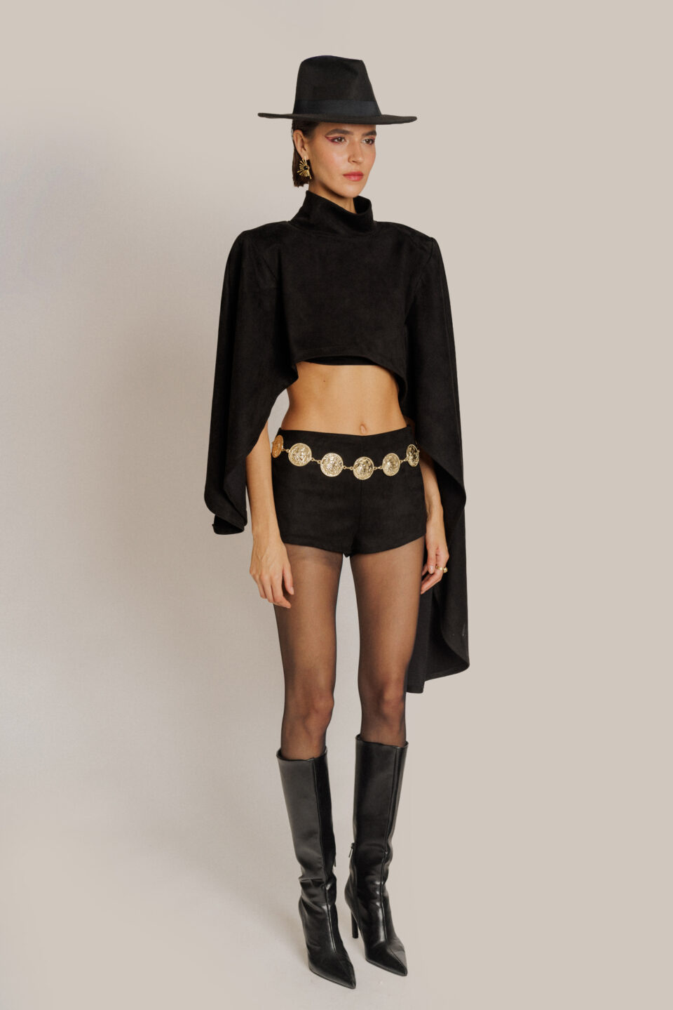Peluş ve nubuk kumaş kullanılarak özel olarak Eclectic atölyesinde üretilmiştir. Bedenli esnek beden aralıklarına sahip bir modeldir.