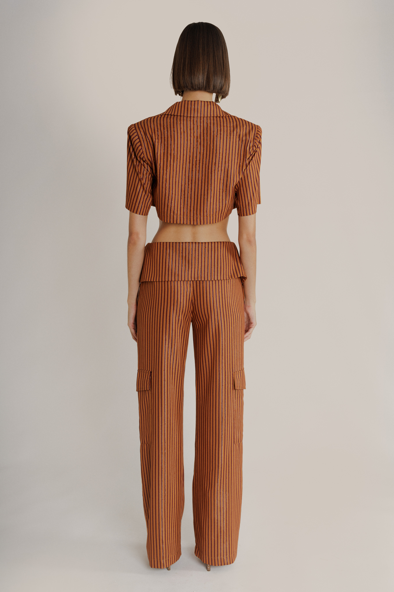 Parlak çizgi dokulu kumaştan özel olarak Eclectic atölyesinde üretilmiştir.