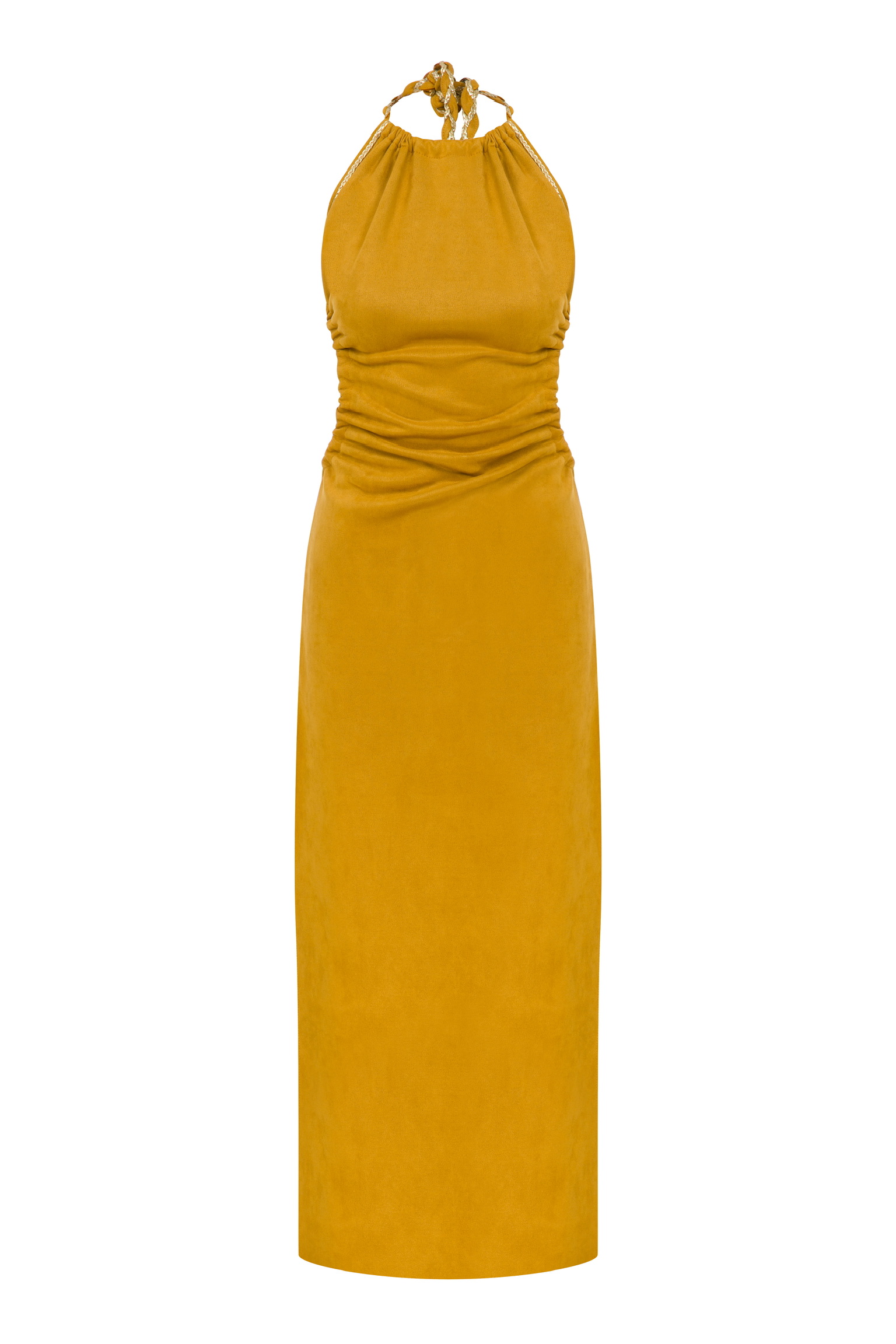Nubuk kumaştan özel olarak Eclectic atölyesinde üretilmiştir. Dekolte bölgesi büzgü yapılarak kullanılmaktadır.