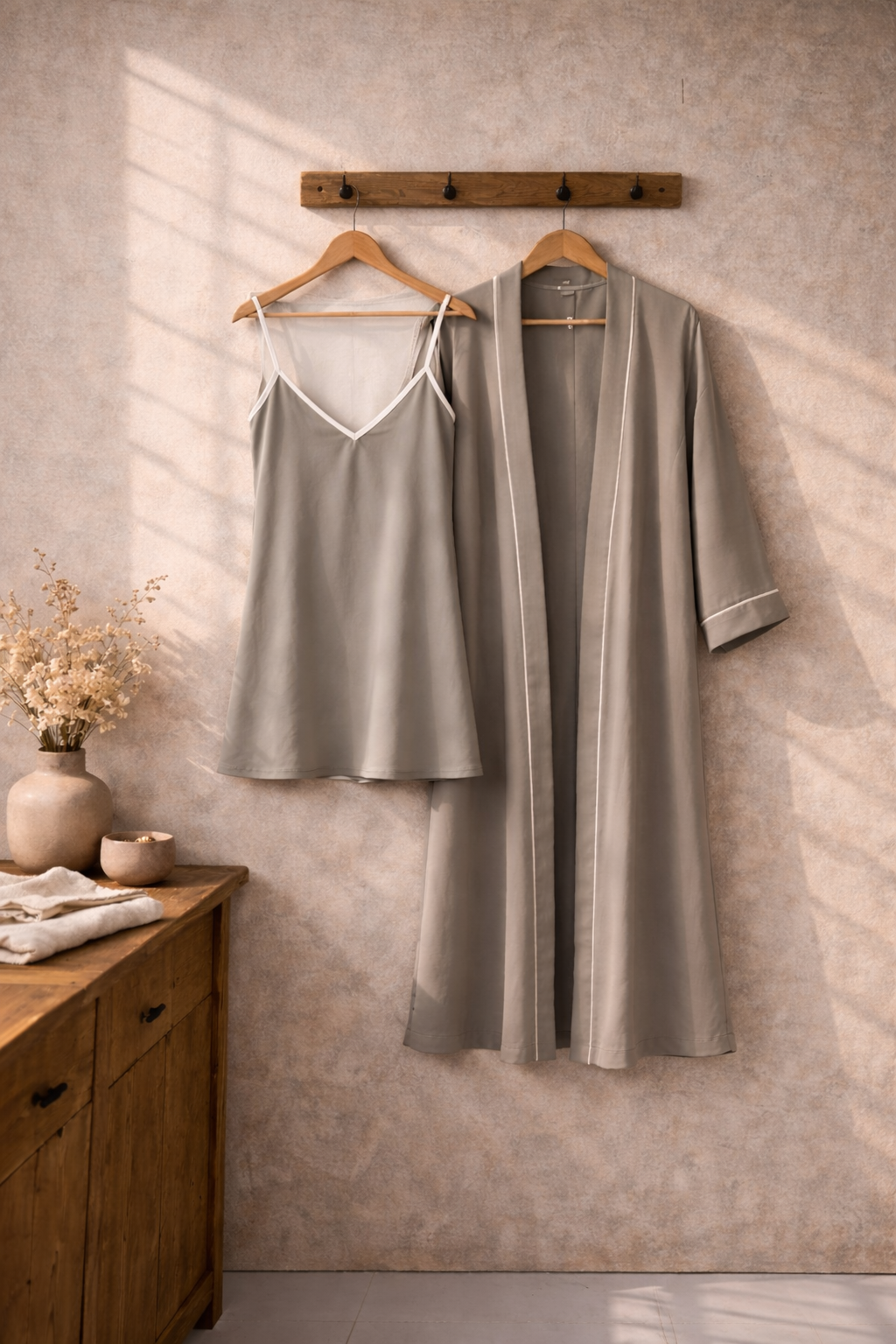 Slip gecelik sade V yaka kesimiyle zarif bir siluet oluştururken, kimono rahat kalıbıyla hem tamamlayıcı hem de çok yönlü bir kullanım sunar. Sabah rutinlerinde, evde dinlenirken ya da valizinizde şık bir lounge alternatifi olarak ideal bir settir.