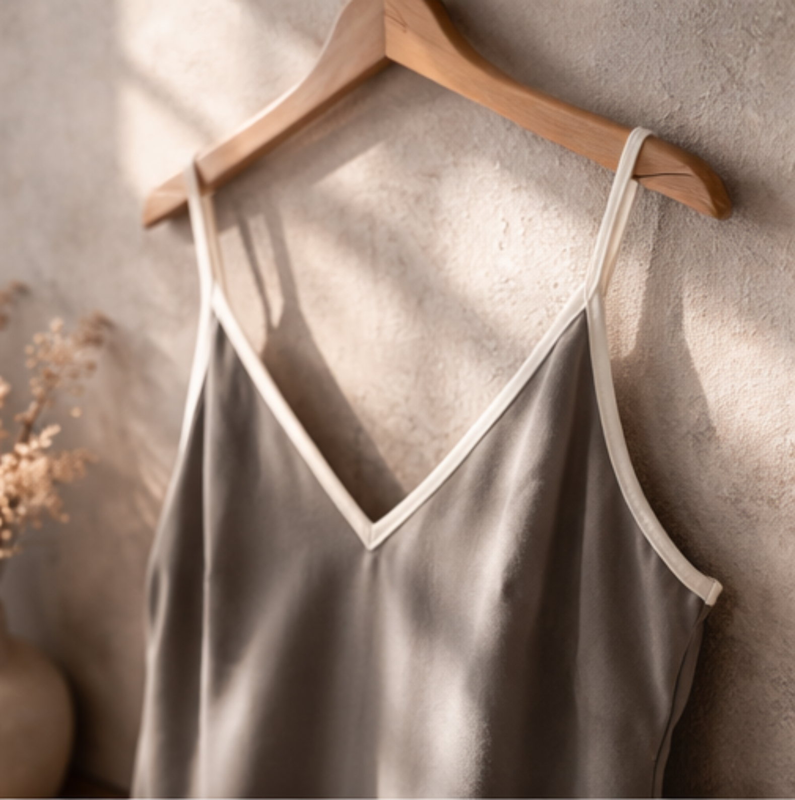 Kontrast biyeli V yaka detayı zarif bir çerçeve sunarken, ince askıları feminen ve minimal bir görünüm sağlar. Modal kumaşın nefes alabilen ve nem dengeleyici özelliği sayesinde gece boyunca konfor sunar.