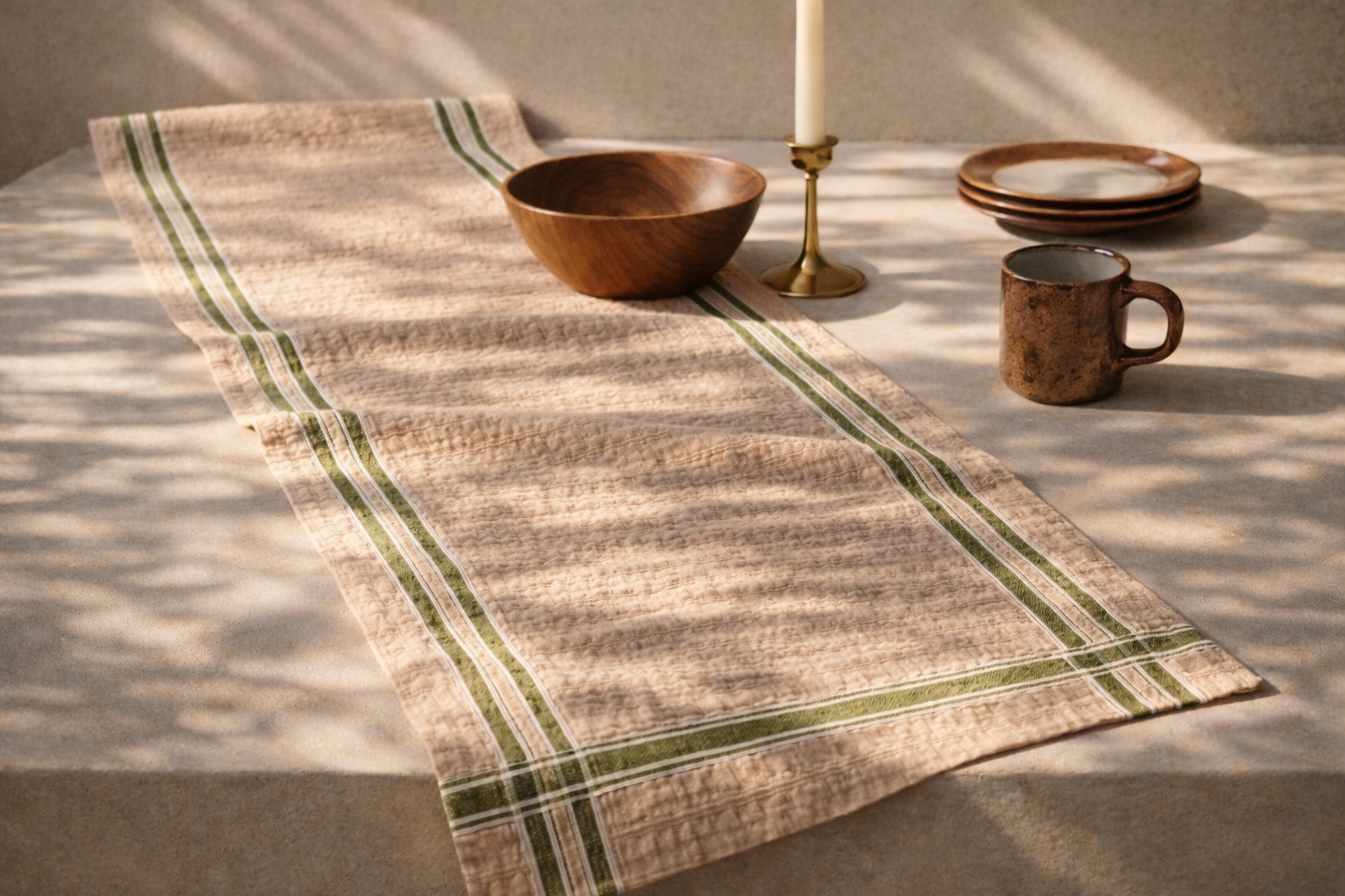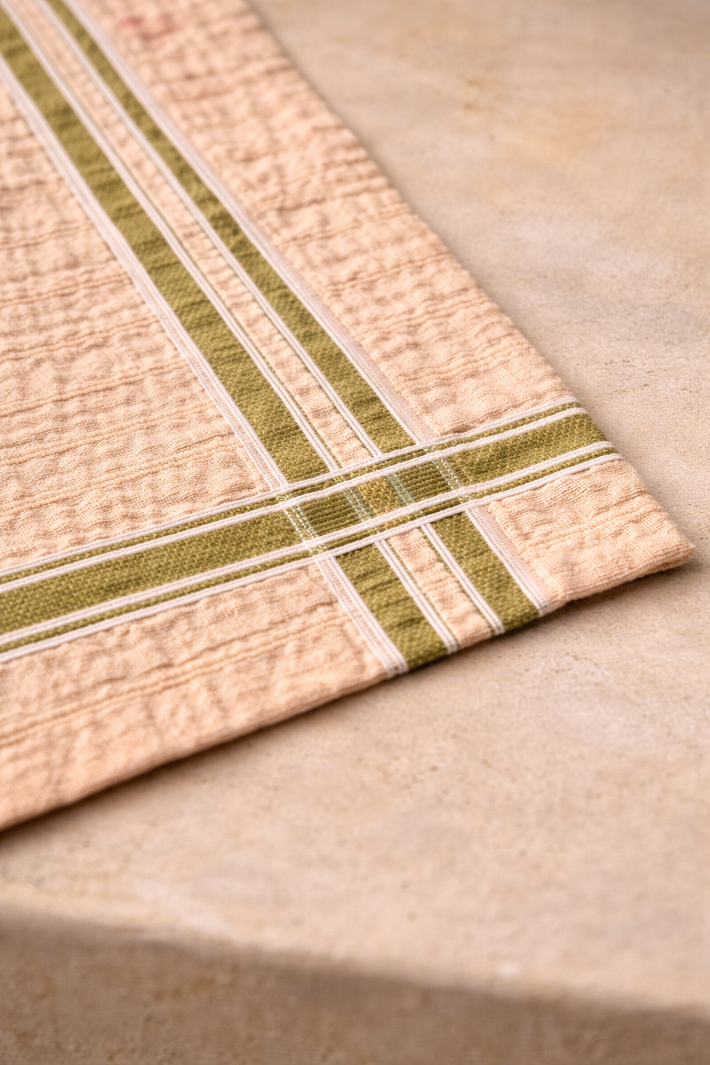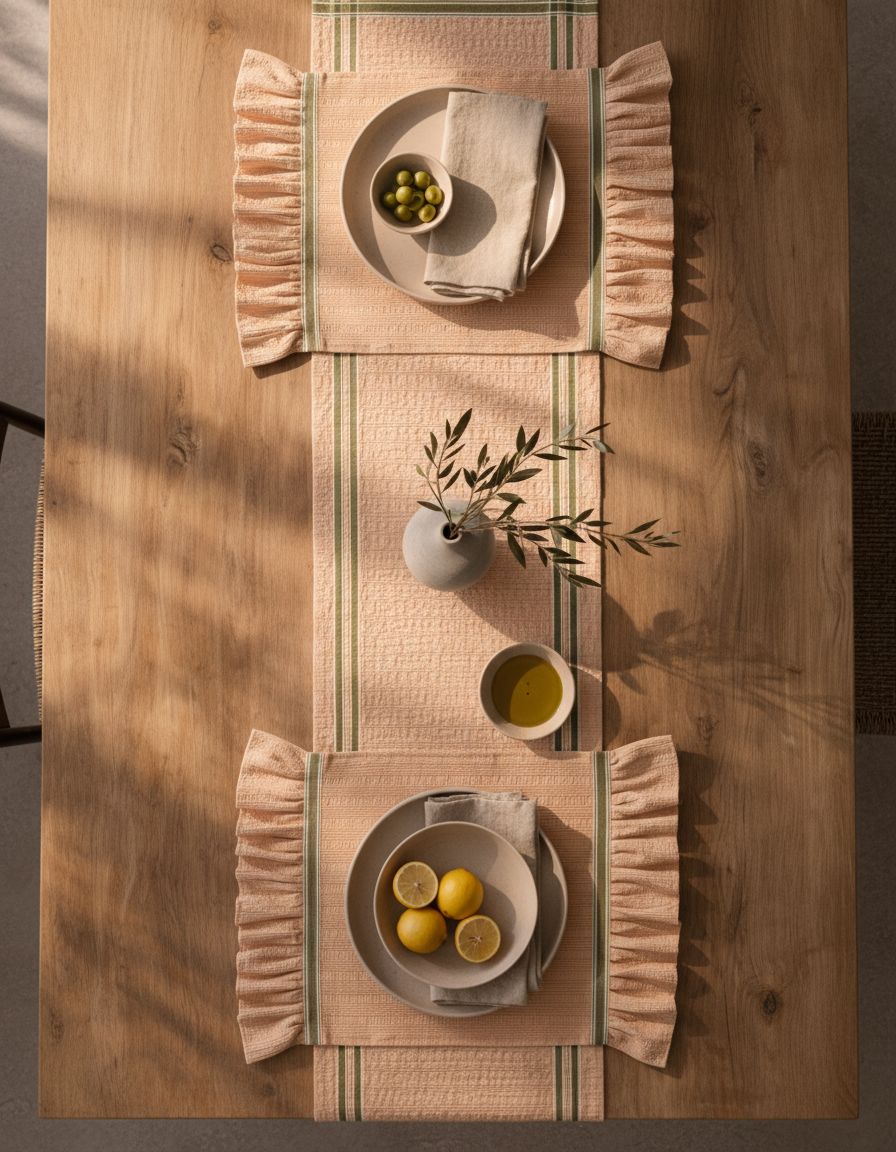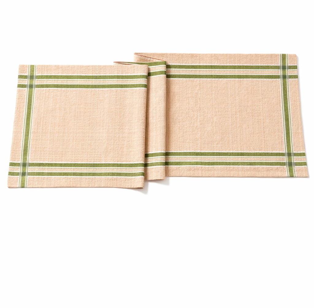 Her iki yanında uzanan zeytin yeşili çift şeritler, sıcak şeftali-bej zemin üzerinde doğal ve dengeli bir kontrast oluşturur. Kompozisyonu zamansız, uyumlu ve rafinedir — hem günlük sofralar hem de özenle hazırlanmış davetler için idealdir.
