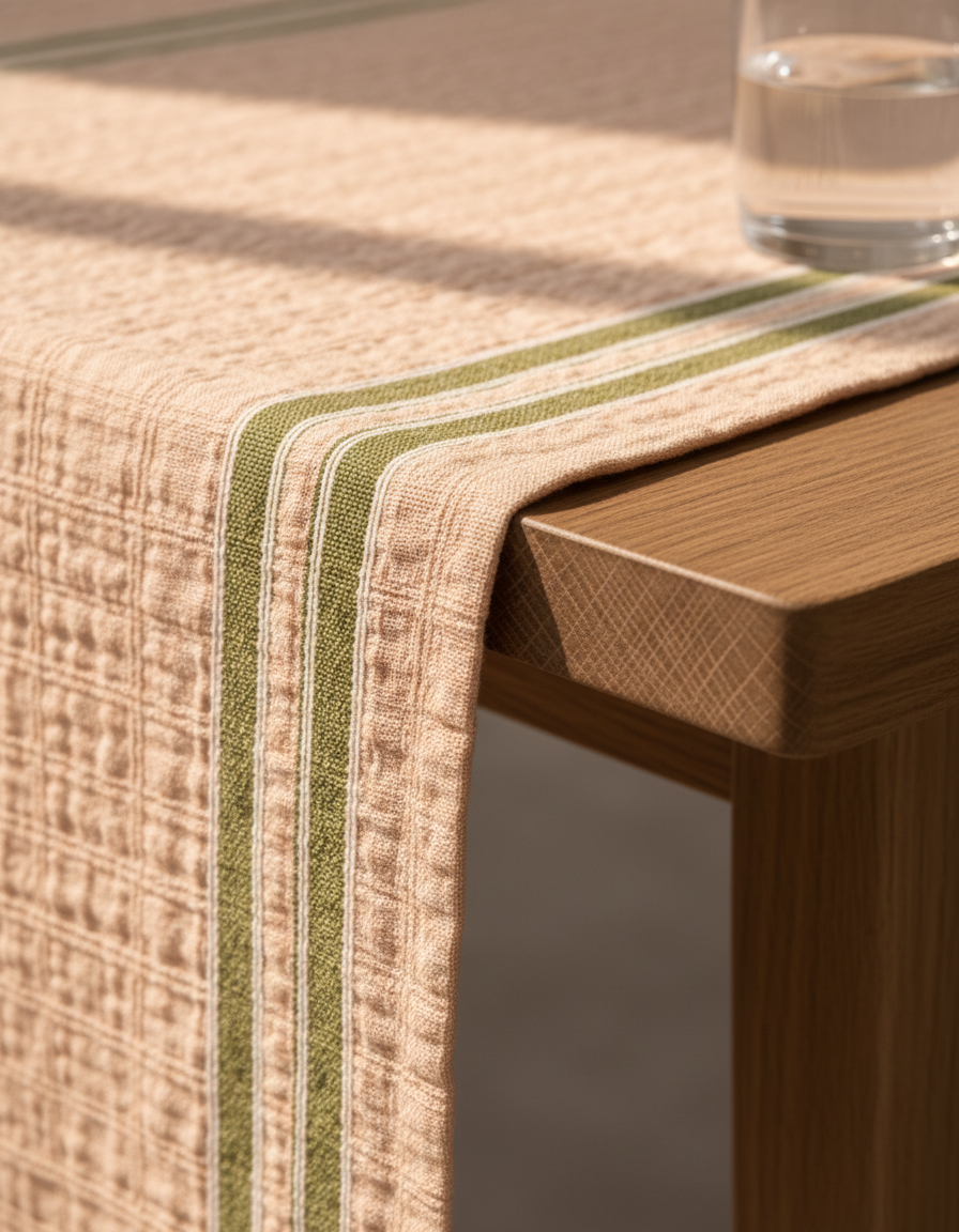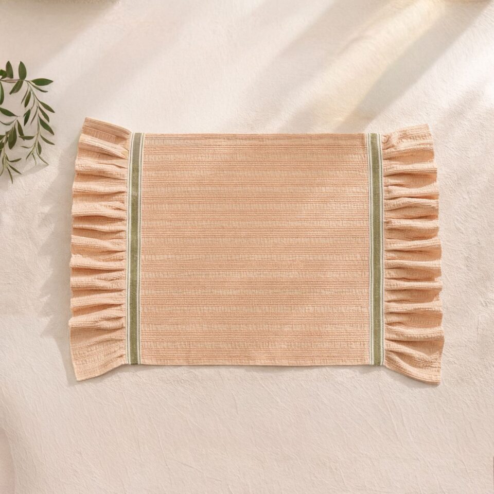 Özenle dokunmuş bu şeftali tonlu masa runner’ı, yüzeyindeki hafif kabartmalı yatay doku sayesinde sade tasarımını bozmadan derinlik ve dokunsal bir zenginlik sunar.