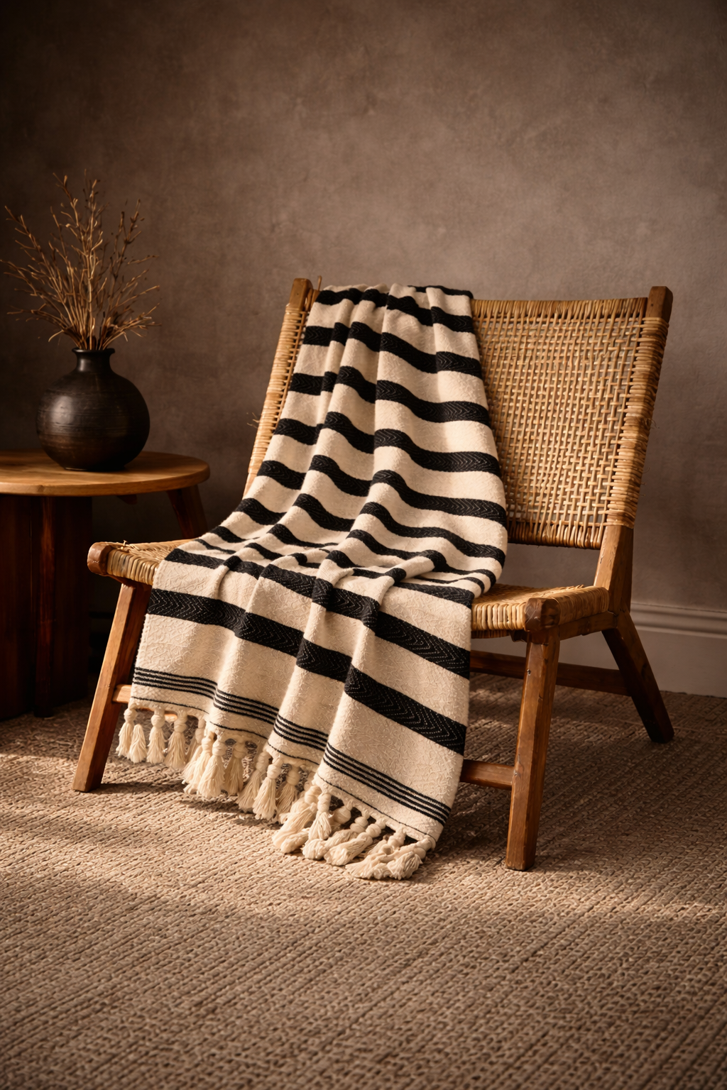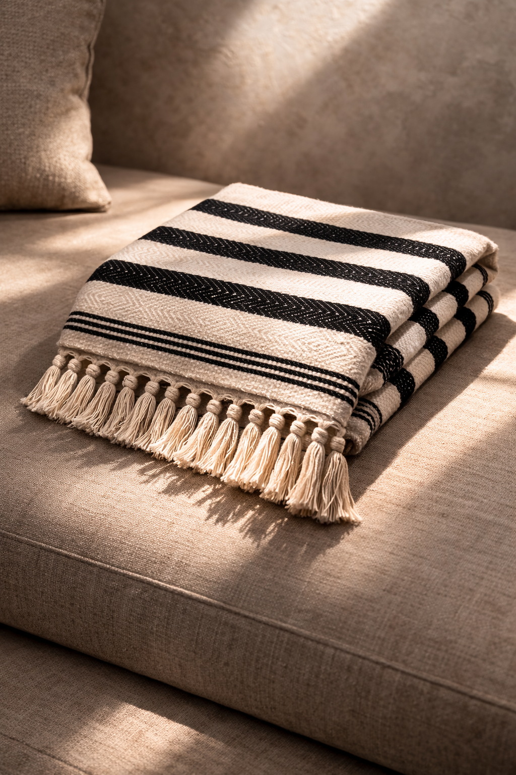 Siena Stripe Throw; siyah ve doğal krem tonlarının güçlü kontrastını, dokuma yüzeyindeki el işçiliği hissi veren dokusuyla buluşturur. Minimal çizgi formu modern bir görünüm sunarken, sıcak tonları sayesinde zamansız bir karakter taşır.
