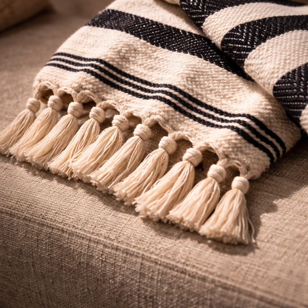 Püskül detayları ürüne hareket kazandırırken, çizgili tasarımı mekâna güçlü ama dengeli bir kontrast katar. Modern ve sıcak bir atmosfer oluşturmak isteyenler için ideal bir tamamlayıcıdır.